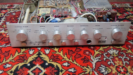 Всем привет! Хочу сегодня поделиться опытом в ремонте усилителя Бриг - 001 Стерео. Друг принес усилитель, пропал звук в одном из каналов. Усилитель у него работает с АС S90, поэтому версию о неправильном подключении нагрузки можно отбросить. Сняв защитный кожух, и осмотрев платы, я выяснил что сильно греется радиатор транзистора КТ961А, в неисправном канале. Радиатор, раскален при работе усилителя. Демонтировав плату с радиатора, я проверил транзистор мультиметром в режиме диодной прозвонки. Транзистор звонился как исправный...