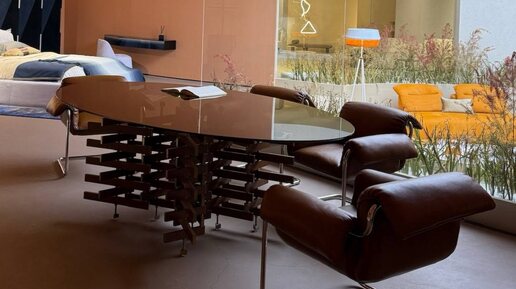 🔸 Стол — торжество архитектуры: Уникальное основание из ритмично расположенных деревянных ламелей создает завораживающую игру света и тени. Овальная столешница из дымчатого закаленного стекла подчеркивает сложность базы, оставляя её видимой со всех ракурсов. Это не просто стол, это скульптура. 🔸 Кресла — икона стиля: Классический силуэт в духе Баухауса на кантилеверном (консольном) каркасе...