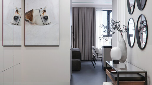 Перед вами согласованная версия визуализаций холла, в нашем проекте интерьера квартиры в стиле неоклассика, которая расположена в ЖК Крылья в Москве. Справа от входной двери мы поставили композицию с консолью, пуфиком и декоративными зеркалами. Здесь будет удобно хранить перчатки, ключи и какие-то мелочи. Напротив на стене мы разместили зеркало высотой до полотка. При этом зеркало мы сделали из сегментов, а не цельное. Во-первых, это добавляет графичности в интерьер, а во-вторых — мы заранее продумали как такого размера зеркало пронести на объект и смонтировать с оптимизацией бюджета...