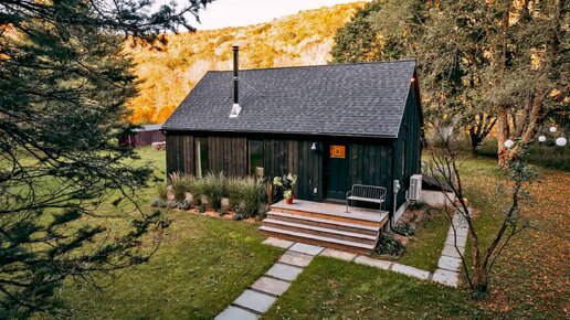 Простой каркасный дом: черные фасады, бюджетный интерьер в скандинавском стиле, дополнительная спальня на антресоли