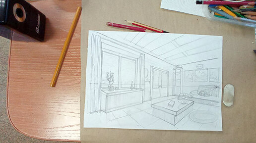 Описание рисования интерьера комнаты с фронтальной перспективой, одной точкой схода - в предыдущей статье. Но такое направление взгляда в помещении, когда он идет перпендикулярно противоположной стене - это только частный случай перспективы интерьера. Нарисуем теперь вид комнаты, когда имеется две точки схода. Начнем с линии горизонта: проведём ее и обозначим эти две точки. Определим, где находится видимый угол и на какой высоте находится горизонт. Проведем направляющие линии для двух стен в точки схода...