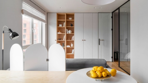 На примере реальных дизайн-проектов показываем, как может преобразить пространство встроенная мебель. Вопрос с хранением в этой маленькой квартире решили с помощью шкафа во всю ширину гостиной — для этого пришлось отказаться от привычной ТВ-тумбы. Фасады шкафа заказали в цвет стен, чтобы максимально «растворить» мебель в пространстве и замаскировать массивность шкафа. Место для телевизора все же нашли: его ставят на треногу напротив дивана Саннес от divan.ru. ▶️ Товары бренда divan.ru: Диван | Стол...