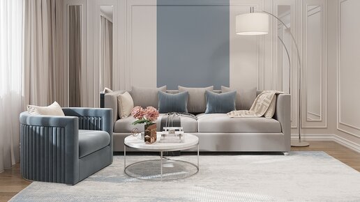Дизайн интерьера трехкомнатной квартиры площадью 78 кв.м. оформлен нежной цветовой палитрой, созданной дарить гармонию и спокойствие. Проект щедро дополнен молдингами и рельефами, а цветовая гамма гармоничная и спокойная. Гостиная, кроме лепного декора, имеет зеркальные вставки в своей композиции оформления стен. Такой прием расширяет пространство, облагораживает его и отражает свет. По традиции, симметрично напротив, расположилась зона ТВ. Рельефы словно перетекают и расплываются со стен на мебель: на фрезеровку тумбы и обивку кресла, объединяя все линии...