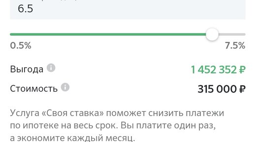 Начал изучать вопрос дополнительных денег на строительство дома. На первый взгляд отличный вариант - ипотека с господдержкой на строительство дома своими силами. В приложении банка очень за интересовал вопрос услуги "своя ставка", указано, что можно разово заплатить и снизить ставку на 6,5 % годовых...