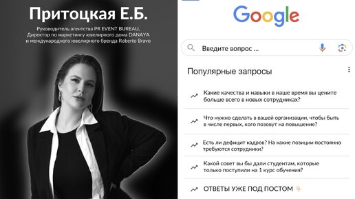 Руководитель агентства PR EVENT BUREAU, Директор по маркетингу ювелирного дома DANAYA и международного ювелирного бренда Roberto Bravo - Притоцкая Елена Борисовна 1. Какие качества и навыки в наше время вы цените больше всего в новых сотрудниках? В новых сотрудниках, как в молодых специалистах, я больше всего ценю адекватность, ответственность и умение адаптироваться, так как сейчас быстро меняется информационная среда и появляются различные нововведения в бизнесе, а также для меня самое важное в сотрудниках и людях в целом, это ответственность...