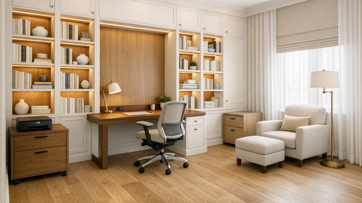 Кабинет в современной классике: библиотека до потолка, тёплый дуб и идеальный свет для продуктивности