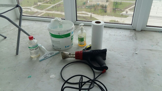 Здравствуйте, мои друзья! Как хорошо, что вы есть и к вам можно обратиться. Столько дали нам полезных советов, как и чем можно отмыть защитную пленку с пластиковых окон. Попробовать их все я не смог, но защитную пленку и клей, который остался от нее, очистил. Может, мой опыт будет для кого-нибудь тоже полезен. Для очистки мне понадобились: - строительный фен, - шпатель шириной 5–6 см, - уайт-спирит, - губка, - жидкое мыло, - вода, - ветошь (тряпки). Все что нужно для очистки пластиковых окон. Сначала я полностью снял всю пленку с пластика при помощи строительного фена и шпателя...