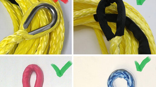 Для краткости и простоты восприятия сделал такую картинку по коушу для синтетического троса. Долго думал как быть с трубчатым коушем. Их бывает несколько видов. Основное отличие это "свободный" и с зафиксированными концами (с перемычкой). С перемычкой более правильный. На мой взгляд целесообразность даже этого "правильного" коуша нулевая в наших условиях. Но и вреда нет. Красота и понты — вполне годный мотив для его использования...