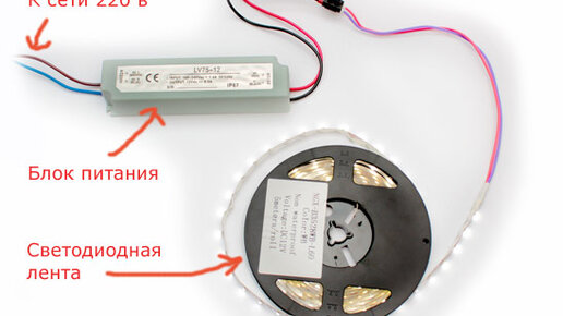 Светодиодная лента работает от напряжения 12 вольт. У нас в розетке 220 вольт. Соответственно, чтобы запитать ленту, необходим блок питания. Один конец блока питания подключаем к сети 220 вольт, другой конец к светодиодной ленте. Все просто Электрическая схема подключения светодиодной ленты Важный момент! Обратите внимание, на выходе блока питания два провода разного цвета и светодиодная лента тоже имеет разные провода. Это сделано не случайно. Красный провод — это плюс, синий (или черный) провод—это минус...