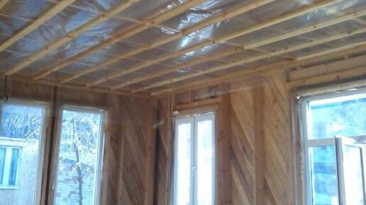 Вот так примерно выглядит результат. Но обрешетку потолке вы видите доску 100×25, распущенную вдоль, то есть 50×25. Крепилась она с шагом 400 мм по центрам. Этой обрешетки должно хватить под гипсокартон 12,5 мм или деревянную вагонку (пока точно не решил). Перед монтажом обрешетки на скобы была прибита полиэтиленовая толстая (200 мкр) пленка, которая будет пароизоляцией утеплителя...