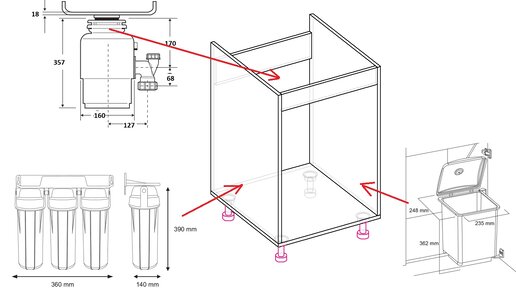 Обычно рассуждают так: "Кухня маленькая - поэтому мойку (тумбу под нее) надо сделать тоже как можно меньше". И это в корне не верно. Размеры тумбы под мойку не определяются только выбранной моделью раковины. Сам по себе шкаф под ней - отличное место размещения всего того, что другого места на малогабаритной кухне попросту не находит. Но начнем по порядку - с размещения необходимого. Бытовые приборы и коммуникации На своем сайте я как-то уже рассматривала пример расчета размеров тумбы под мойку с учетом размещения измельчителя бытовых отходов, фильтра для воды и мусорного ведра...