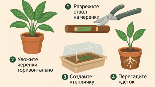 В дополнении к посту: “Как омолодить аглаонему” Если у аглаонемы ствол вытянулся — его можно пустить «на молодняк» целой партией. Делается так: 📌 1️⃣ Разрежь ствол на кусочки