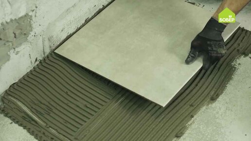 Напольная плитка значительно прочнее, чем настенная, но и для её укладки существуют свои хитрости. Расскажем, как правильно нанести клей, для чего нужен зубчатый шпатель и с помощью чего получить между плитками идеально ровный шов. Рабочая поверхность может быть не очень ровной, однако будет лучше, если вы её предварительно выровняете. Обратите внимание: на обратной стороне каждой плитки указано направление, как её следует укладывать (в нашем случае стрелочкой к стене). Это нужно для того, чтобы рисунок совпадал...
