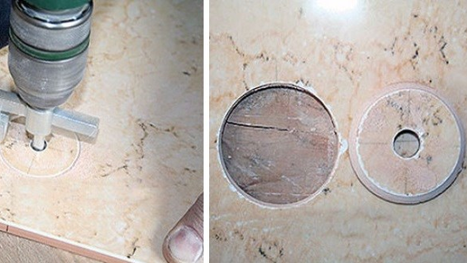 Чтобы вырезать большое отверстие в керамической плитке применяют сверла-балеринки или коронки. За отсутствием таковых можно применить такой способ. Намечаем центр окружности на плитке с двух сторон. Делаем болгаркой с диском по плитке пропилы максимально от края до края круга. С обратной стороны делаем аналогичные пропилы...