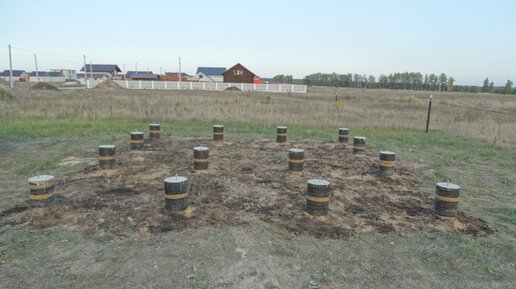 Это не пеньки среди поля, а сваи под будущий каркасный дом. Но сваи не простые, а буронабивные! Если честно, то я вполне понимаю людей (застройщиков-самостройщиков), которые не приемлют торчащие из земли столбики. Ведь есть плита (шведская, финская или еще какая-нибудь утепленная...), ну или, на крайний случай, ленточный фундамент. Поначалу так и хотел залить монолитный бетонный периметр. Но уж больно мне не понравился расчет стоимости реализации такой затеи. При условии, конечно, что домик (а может баня) каркасный будет, своими руками, и под него мощный фундамент не требуется...