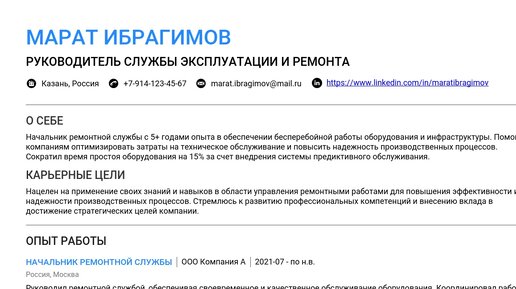 Пример резюме начальника ремонтной службы поможет вам быстро понять, как создать сильный документ, который заинтересует работодателя. Изучение готовых примеров – ваш прямой путь к успешному трудоустройству на эту должность. На этой странице мы предлагаем готовые примеры резюме начальника ремонтной службы, которые помогут понять, как составить эффективное резюме с учетом . Вы получите подробные пошаговые инструкции для каждого раздела резюме, что будет полезно как начинающим, так и опытным специалистам...