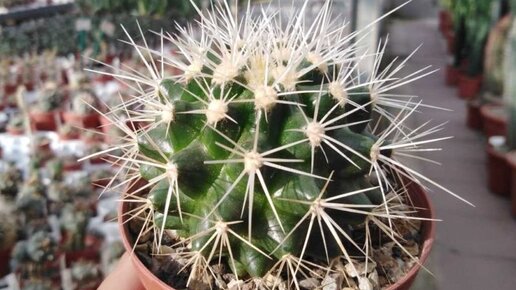 Пожалуй, самыми распространенными комнатными растениями являются кактусы. Многие любят выращивать эти суккуленты на своих подоконниках. Они не требуют дополнительного ухода и подойдут даже начинающим любителям растений. Описание вида Эхинокактус Грузони шарообразный выглядит как небольшой шар в диаметре до 40 см. Он имеет ярко-зеленый стебель и у взрослого кактуса можно насчитать до 30 ребер на стебле. На этих ребрах располагаются белые или светло-желтые цветки. В самой верхней точке стебля кактус имеет трубчатые цветки белого цвета с желтым оттенком...