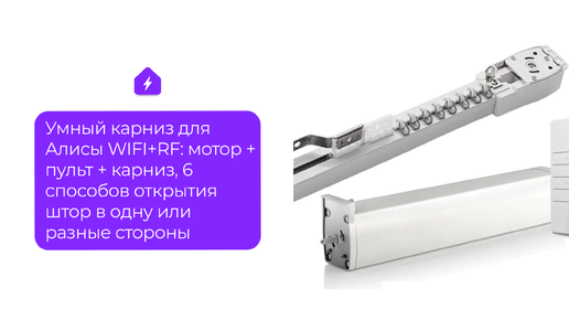 Умный карниз для Алисы WIFI+RF: мотор + пульт + карниз — это устройство, которое полностью контролирует окно. Открывает и закрывает шторы по вашему расписанию, регулирует уровень освещения. Карниз от Izba Tech не требует сборки! Всё, что вам нужно — распаковать коробку с карнизом и установить его на потолок. Карниз можно использовать в трех функциональных вариантах: Основные характеристики умного карниза: Питание от сети: 220. Размеры: 3000х50х30 мм. Размер мотора: 225х50х70 мм Поддерживаемые протоколы и ПО: Wi-Fi, RF...