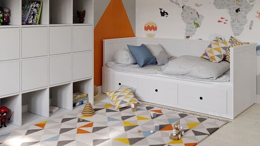 Раскрываем секреты. Обои с картой мира, заселенной милыми животными 🦒 и с летающими пестрыми воздушными шарами, занимает всю стену у кровати и задает динамику во всем интерьере. Вариант 1 — детская может занять нейтральную сторону в оформлении. Или наоборот, подыграть рисунку на стене яркими акцентами в декоре...