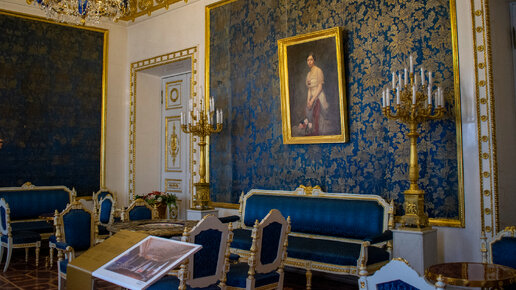 В 1930-х годах архитектор А. А. Михайлов и художники П. Скотти, Б. Медичи создали уникальную Синюю гостиную. В старых источниках упоминается, что эта комната по стилю и композиции напоминает Красную гостиную, но отличается цветовой гаммой и деталями декора. На стенах Синей гостиной размещены штофные панно в золочёных резных рамах, которые были созданы в 30-х годах XIX века. Мебель гостиной выполнена из орехового дерева и обита голубой материей в тон панно. Отделка мебели выполнена в строгом стиле французского классицизма, с использованием золотого декора и стиля «под французский лак»...
