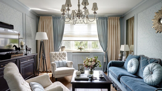 Чтобы добиться эффекта простора, дизайнер Анна Першакова использовала натуральные оттенки и зеркала. Благодаря этому даже хрущёвка выдержала классический стиль с массивной мебелью и обильным декором. Самый простой способ визуально расширить очень маленькое пространство – создать симметрию. В этом случае в гостиной вдоль одной из стен установили диван с велюровой обивкой, за ним создали панно из обоев, а по обе стороны – два панно с зеркалами, возле которых появились тумбы с лампами. Напротив...