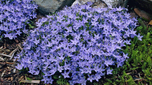Это травянистое почвопокровное многолетнее растение. Цветение колокольчика, начинаясь в июне, растягивается на два с половиной месяца. Его стебли очень нежные и ломкие, но это не мешает растению сильно разрастаться. На длинных ползучих побегах с середины лета (а где-то и раньше) появляются многочисленными голубые, лиловые или белые цветки-звездочки Ø 3-4 см. Если не давать колокольчику расползаться, то можно получить шарообразный кустик высотой до 25-30 см. Колокольчик гарганский ценится за обильное цветение, за которым иногда и листьев не видно...