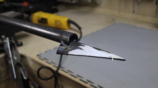 Давно я хотел сделать такой корнеудалитель для сорняков, чтобы не нагибаться за каждым сорняком. Конструкция простая, надёжная, повторить сможет каждый. Время на изготовление буквально один час, ну плюс, минус. Итак, первым делом нам понадобится труба диаметром 50 мм, но можно и другую, просто у меня такая валялась. Ещё две трубы по 1 метру, диаметром 20 мм. Теперь нужно сделать шаблон, возьмём лист бумаги и нарисуем произвольный треугольник. Возьмём пва клей, я пользуюсь клеем "Контакт", он не только для дерева, а так же и для бумаги, поэтому зафиксируем бумагу на трубе...