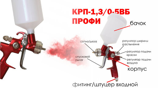 Условно разделить краскораспылитель можем на три составляющих: корпус инструмента, бачок для состава и фитинг для подключения к шлангу компрессора...
