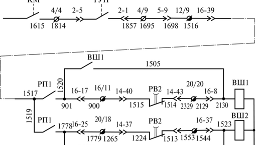 ВШ1 Главные контакты подключают первую ступень резисторов ослабления возбуждения тяговых двигателей. Имеет три вспомогательных контакта: ВШ2 Главные контакты подключают вторую ступень резисторов ослабления возбуждения тяговых двигателей. Имеет три вспомогательных контакта. Цепь управления ослаблением возбуждения тяговых электродвигателей включается тумблером ТУП. Включение реле перехода РП1 происходит при скорости 35—45 км/ч, а реле РП2 при скорости 55—65 км/ч. Образуются цепи питания катушек вентилей...