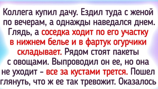 Для одних людей дача — это шашлыки у бассейна, для других — бесконечные грядки с колорадским жуком. В нагрузку к вышеперечисленному обычно идут хитрые соседи и полные сюрпризов родственники. Так что скучать на этом клочке земли просто некогда, вне зависимости от того, растет ли на нем только газон или целое поле кабачков. И истории героев нашей статьи — прямое тому доказательство. Коллега купил дачу. Ездил туда с женой по вечерам, а однажды наведался днем. Глядь, а соседка ходит по его участку в нижнем белье и в фартук огурчики складывает...
