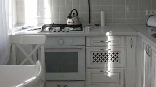 Эта кухня понравится многим хозяйкам, т.к. В комнате по-прежнему можно жить. Она не превратилась в дополнение к кухне. Посмотрим фото Не забывайте жать на палец вверх, если вам нравится кухня. Боковая секция шириной 40 см. С низу — шкаф, сверху открытые полки, где хранятся красивые вещи и соль, сахар и специи, которые всегда должны быть в доступе. Шкаф под духовку, газовую поверхность снизу. Сверху шкаф под вытяжку. Обратите внимание, он закрыт двумя створками. Действительно, шкафы шириной шире, чем 50 см, удобнее открывать, когда установлены 2 фасада...
