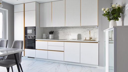 Белая кухня с бархатистыми фасадами и золотыми кромками