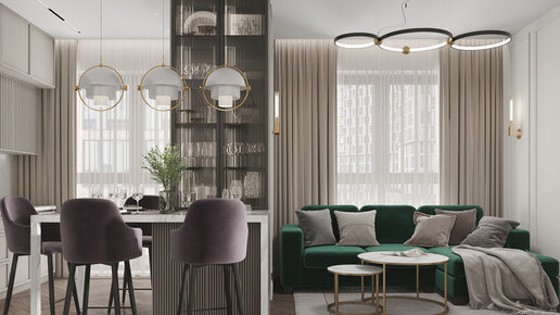Квартира была куплена в ЖК Кутузов Град II с отделкой от застройщика, которая заказчиков не устраивала. Задача: сделать интерьер квартиры в стиле современной классики, спроектировать большую светлую кухню-гостиную и вписать в интерьер изумрудный диван...