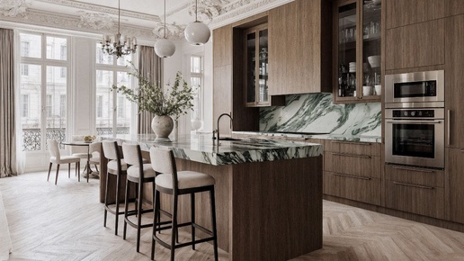 😍 Кухня выполнена в шпоне Орех Американский — материале, который ценят за глубину цвета, выразительную текстуру и исключительную долговечность. Он задаёт интерьеру спокойный, благородный тон и ощущение основательности. Чёткая геометрия отсылает к дворцовой классике, а лаконичные линии и продуманная эргономика к актуальному минимализму...