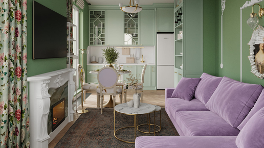 Этот проект — история о вкусе, воспоминаниях и уюте. Интерьер мы разрабатывали для взрослой хозяйки, которая живёт одна, но часто принимает внука. Именно поэтому пространство получилось одновременно элегантным, как того требует стиль сталинского ампира, и живым — с яркими акцентами и уютными деталями. Дизайн-проект двухкомнатной квартиры в стиле сталинского ампира с классическими формами в сиреневых, зеленых и малиновых оттенках с золотыми акцентами с прихожей, кухней-гостиной, спальней, гостевой комнатой, ванной комнатой, санузлом и прачечной...