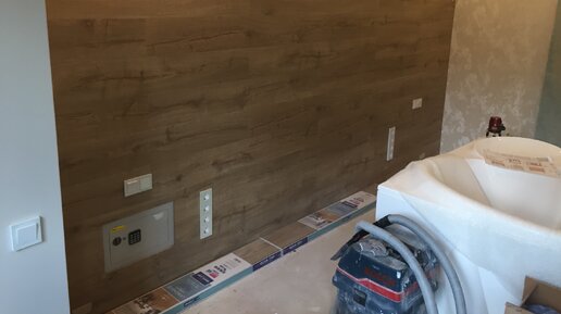 Попросили сделать ламинат на стене, вернее это запланировано по проекту, никогда до этого не делал ничего такого, было интересно попробовать. Почему начал сверху? Из-за ниши для подсветки, если начинать снизу, последний ряд не защелкнуть. Или придётся делать отступ и будет не красиво. Как крепил доски? Изначально была мысль использовать кляймеры (специальные скобы для вагонки), но попросили как можно ближе к стене закрепить, так что выбор пал на паркетный клей из двух компонентов. Единственная проблема, это то, что клей достаточно быстро схватывается, я бы не мог приклеивать по одному ряду...