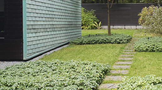 Мы обустроили модульный сад в теневой зоне рядом с входом в дом. Использовали пахизандру, клён и гортензию метельчатую штамповую.