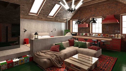 Модный интерьер мансарды в стиле лофт