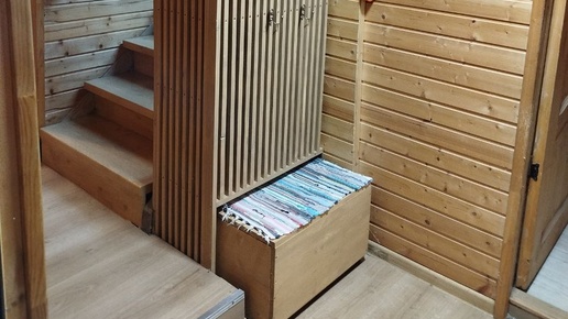 Идея рождалась, что называется, на коленке, но результат радует, хотя и не знаю, правильно ли назвала данный элемент интерьера модным сейчас словом лофт. Получилось, как в принципе и задумывалось, 3 в 1 - перегородка, зонирующая пространство, стеллаж и мини-прихожая. Стало свободнее и достаточно оригинально. Теперь у соседей "тараканы в голове", куда бы что-то подобное себе приспособить. Итак, что имеем. Есть махонький "пятачок" прихожей, в которой 4 двери, начало лестницы и куча верхней одежды по разным крючочкам...