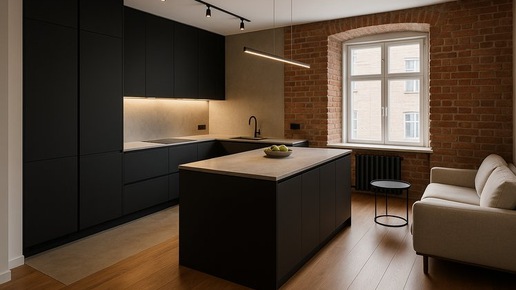 Кухня‑лофт в сталинке: кирпич, чёрный супермат и тёплый северный свет Описание проекта Планировка и сценарии