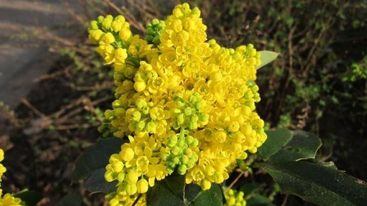 Магония (Mahonia) – небольшой, до 1,5 м в высоту кустарник с глянцевыми, кожистыми, темно-зелеными листьями. Наиболее популярна магония падуболистная (М. aquifolium). Это одно из немногих вечнозеленых лиственных растений, зимующих в условиях средней полосы. Крупные перистые листья снабжены острыми колючками. Осенью и весной листья окрашиваются в красноватый цвет. Магония необычайно красива весной, в период цветения. Ярко-желтые цветки собраны в плотные прямостоячие соцветия-метелки. Под конец лета созревают сизовато-синие съедобные плоды, которые, впрочем, почти никто не ест...
