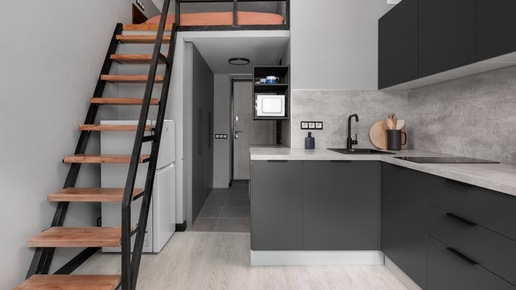 Маленькая студия в стиле лофт 15 м² со спальней на антресолях