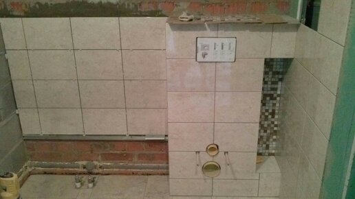 Установка туалета. А не всё так сложно... Вот так выглядит инсталляция после установки и обшивки её плиткой. А пока отмотаем на момент её отсутствия. Далее собственно будем класть плитку с запиливанием углов и вырезанием в ней отверстий...