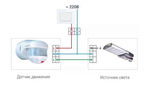 Для решения различных задач датчики движения подключаются по различным схемам. Наиболее простой вариант – прямое включение осветительного прибора, как показано на рисунке ниже.