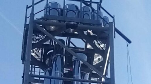 Монтаж металлической башни дымовой трубы районной газовой котельной на финальной стадии. Высота дымовых труб – 33 метра.