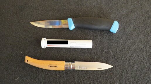 Мусат / точилка здорового человека: Мусат / точилка туриста: Делай раз. Находим старые советские камешки от какой то технической то ли точилки то ли вообще хрен знает чего :) Кстати если кто знает от чего - просветите. Для масштаба садовый опинель №8 (длина клинка 8,5 см, длина ножа 19,1 см). Делай два. Ищем куда его можно "упаковать"/впендюрить. Находим довольно прочную баночку сами знаете из под чего :) Алюминий конечно может помяться от ударов или падений, но от сколов камешек он точно защитит...