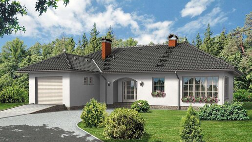Проект одноэтажного дома в стиле прованс с гаражом и открытой террасой