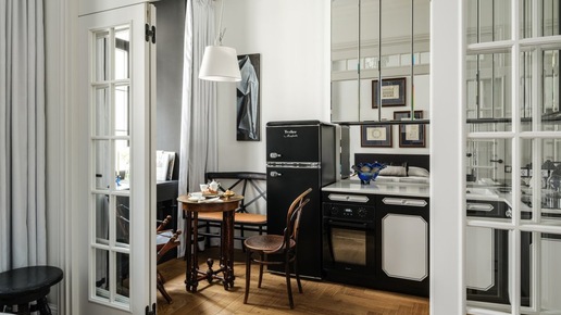 Зеркальная кухня, антиквариат и авторская мебель: как реконструировали однушку 27 м² в старом фонде