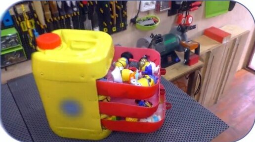 Наверняка у многих из Вас имеется гараж или небольшая мастерская, а для удобства хранения в ней различной мелочевки приходится приобретать различного рода органайзеры. В данной статье мы сделаем очень удобный органайзер для различной мелочёвки Такая самоделка весьма проста в изготовлении, а материалы из которых она будет сделана Вы зачастую выбрасываете. Материалы: — Пластиковые канистры от строительных смесей — Листовая фанера, ДСП, саморезы по дереву — Крепления для труб, стальная полоса — Аэрозольная эмаль, наждачная бумага...