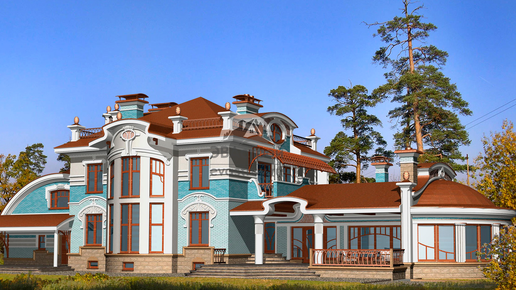 Хотите, чтобы ваш загородный дом выглядел необычно и выделялся на фоне соседних коттеджей? Обратитесь к стилю модерн. В приведенном проекте показан просторный трехэтажный особняк площадью 627 м2. Кроме запоминающегося внешнего вида, ему присущи такие достоинства, как: Дом состоит из жилого корпуса (два этажа + цоколь) и двух технических пристроек, в одной разместился бассейн с террасами, в другой — гараж и большая кладовая. Для экстерьера характерно обилие округлых и изогнутых линий, эркеры, арки, колонны с овальными навершиями...